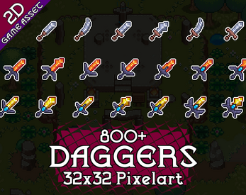 This exceptional pack offers an impressive collection of 160 unique daggers crafted in 32x32 pixel art. With 5 distinct variations for each dagger, you'll find yourself equipped with an total of 800 daggers to choose from.