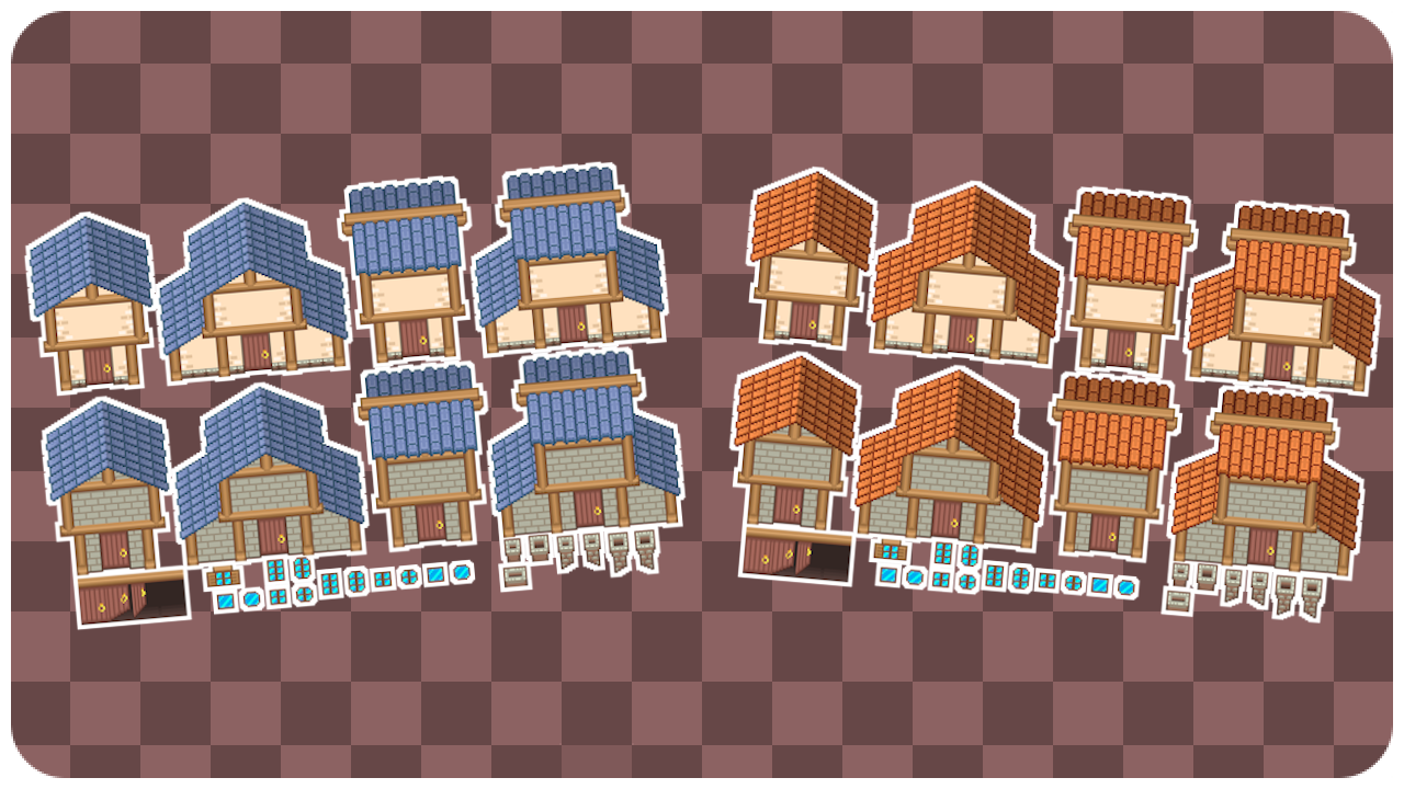 This pack includes a variety of houses and props that you can use to create new villages and towns for your game!